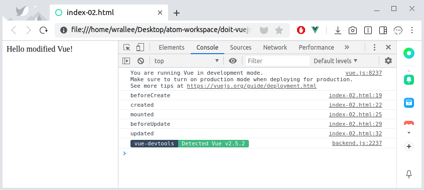 this.message = 'Hello modified Vue!'